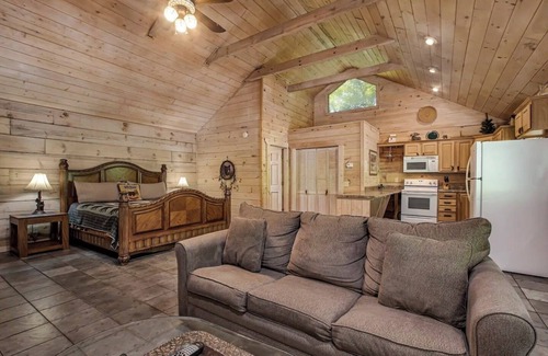 This modern log cabin is a large studio with a spectacular king size bed! There is also a fold out Queen size sofa in the living room. From the real logs to the rustic tile floor this cabin is definitely elegance in the mountains. It has a full kitchen, one bath, 65" Smart TV with fast Wi-Fi and washer dryer. Surprise your 'Sweetheart" this weekend. She will love the large hot tub, rocking chairs on the porch and porch swing. It is the perfect place to forget your worldly cares and dream away.
