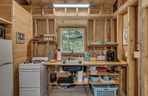 CABIN RENTALS • Your Trailside Ranchhosts are Tiffany and Adam Light along with their daughter and son in law, Makena and Jonah Denton. On site hosts are always available. Our Sugar Shack cabin was originally built circa 1940 and rebuilt in 2018. The cabin has been completely modernized and refurbished yet maintains its original authentic rustic charm. It is a beautiful one bedroom, 1 full bath cabin that sleeps 2 guests; The master bedroom overlooks beautiful Otter Creek where you can enjoy the peacefulness of water flowing whiling falling asleep at night. It has a private screened in porch with a propane fireplace that also lends a view of Otter Creek. There is an open kitchen dining area, And a cozy living room with a propane fireplace. The Sugar Shack has a full service kitchen equipped with dinnerware, appliances and cooking utensils. Linens andtowels are supplied for each guest. The comfy cabin is heated using a propane fireplace. There is a gas grill for outside cooking. Smoking is allowed on the porch only and is not permitted in the cabins.