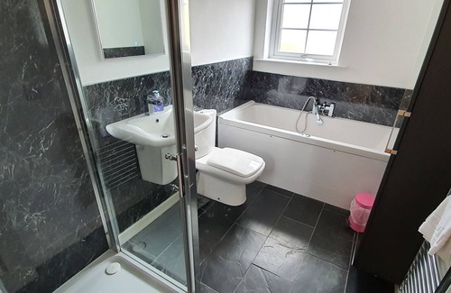 There is one bathroom, which has a toilet and sink, a bath and a walk-in shower.