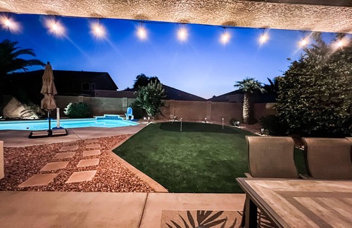 Escape to a relaxing Arizona getaway in a wonderful neighborhood offering 4-bedrooms, 3-bathrooms. This beautiful home is across the street from the green belt and walking trail. Featuring large ceilings and an open floor plan with a loft, private pool, outdoor grill and eating area, putting green, and fully equipped Kitchen with quality appliances and all the cooking/dinning utensils needed to dine in, large dinning area, formal living room and much more.