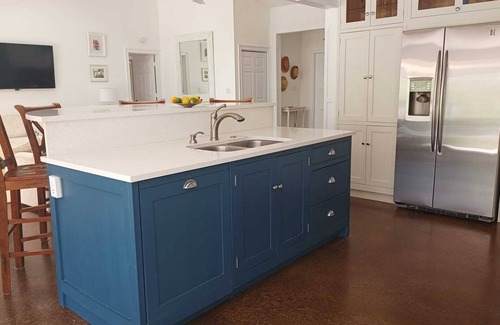 The house provides well laid out, open plan accommodation for up to 6 people. It boasts marble effect stained concrete flooring, low level lighting, four newly installed skylights in 9ft tunnels with accent lighting, custom built, hand painted shaker style kitchen imported form UK cabinet makers 'Yorkvale kitchens' with designer Pompeii quartz countertops, new high end stainless steel kitchen appliances, enormous 500.sq ft. master bedroom suite with Robb and Stucky furnishings, walk in closet, and remodeled bathroom, shower and toilet, large second bedroom with two single beds (can be joined to form a king bed), walk in closet, newly remodeled Jack and Jill bathroom with hand painted cabinetry from UK cabinet makers Yorkvale, cabinet to ceiling mirrors, new bath with shower. There is a sofa bed for additional guests. Outside and accessed from the living area is a newly laid 650sq. ft. travertine tiled patio and newly fitted Florida blue composite decking with inground accent lighting, outdoor bbq, quality patio furnishings and great views over the back yard. Accessed through a small path at the bottom of the yard is a private woodlands for sole use of "The Woodlands" residents with a gorgeous, secluded, private heated swimming pool. The pool is rarely used.