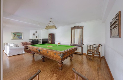 LOWER LEVEL AND GARDEN: Family room with plasma Satellite TV, SKY TV, DVD, and stereo. A very comfortable space to watch a movie, listen to music, or play billiards while gazing at the garden below. A sofa bed is available upon request. Also on this floor is a guest bathroom and laundry room with washing machine/dryer and iron with ironing board.