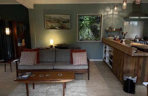 Self contained open plan living, super comfortable bed with cool Mid Century pull out sofa bed for added guests. Indoor bathroom accessed by adjoining deck. (separate from main living space). Enjoy the Japanese bath and open shower open to the forest or wonder through the beautiful bush to the Cedar tub nestled beneath Majestic Giant Puriri.