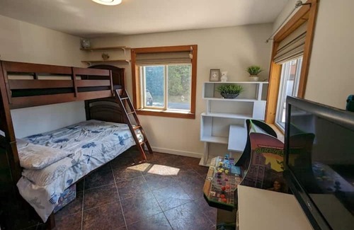 Our home features open concept living and dining area, wood burning fireplace, loft style bedroom with pull out queen sofa bed and 2nd bedroom on main with double/twin bunk beds. We also have a third bedroom with Twin loft bed for those with kids!