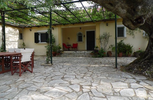 A 180 sq. m. beautiful villa of traditional architecture and modern facilities in a 11-acre olive-tree surrounded by a paved courtyard with trees and flowers. Situated at a 10 minute drive from many beautiful beaches, the house is build around a 700-year-old olive tree. All rooms and living room are air conditioned and ceiling fans are also available. Table tennis, badminton and bicycles are available for the guests. It is situated 70 meters away from the main road, in a non-touristic village,This house is build according to local architecture with the facilities and amenities of a full residence. Situated in a serene and peaceful environment amongst an 11-acre olive grove, yet 10 minutes drive from the beach and the town.This house is build according to local architecture with the facilities and amenities of a full residence. Situated in a serene and peaceful environment among an 11-acre olive grove, yet 10 minutes drive from the beach and the town.