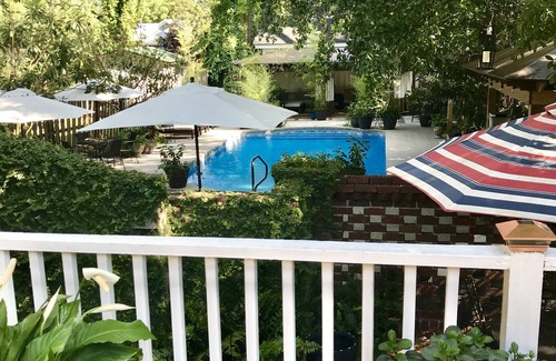 The historic but completely renovated home includes a comfortable living room, a dining room that seats eight, a well-equipped kitchen, and a large back deck. The two bedrooms each have their own en suite bathrooms with walk-in showers. Additional sleeping is available on the fold-out sofa in the living room. The front porch, deck, courtyard, and private pool areas offer great outdoor space for enjoying coffee in the morning and cocktails in the evening, as well as a great place to soak up the sun or lounge in the shade!