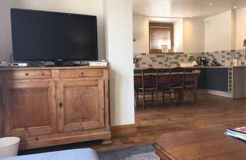 On the ground floor you will enter into a large open plan kitchen/dining area (seating 8)the kitchen is brand new and fully kitted out. The kitchen leads into the lounge with TV and DVD. There is also a double bedroom (underfloor heating)at the back with its own large ensuite bathroom (walk in shower). The washing machine is also temporarily located here!