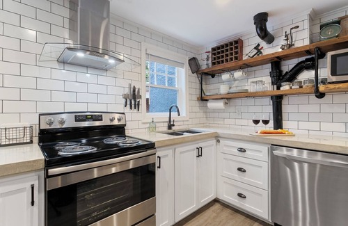 Speaking of the kitchen, you'll love the custom-built cabinets, concrete countertops, salvaged cypress open shelves, and stainless steel appliances. You'll find all the kitchen basics to prepare meals, whether it's a quick breakfast or a gourmet dinner for two.