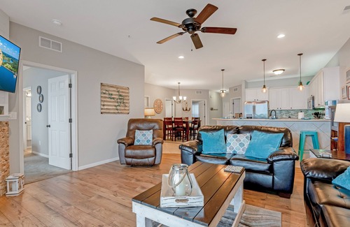 Our condo is freshly decorated. Two king size beds, Full bed and set of Twin bunk beds. TV’s in all bedrooms with cable, Jacuzzi tub, separate showers , walk-in closet and separate sliding doors that open to the large private screened-in lake front patio. You’ll enjoy grilling out on the gas grill while catching the game on the cable TV located on the patio and a small mini fridge to keep your drinks cold while also taking in the sights and sounds of the beautiful lake. The second bedroom features a king bed and attached bath. The third bedroom has a Full and also a twin bunkbed. There is also an extra twin mattress and a twin cot for additional sleeping as well as extra linens and blankets and pool towels. There are a collection of DVD’s to watch, 2 of the TVs are Roku-living room and bedroom 1, but, all have cable. There are also board games to challenge each other and puzzles, or snuggle up with a novel from our reading collection.