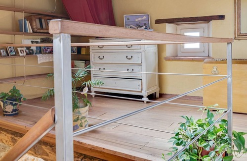 On the second floor, there is a mezzanine with a reading corner, a bathroom with tub, a single bedroom, two bedrooms one inside the other (one with a sofa bed for 2 people and the other with a double bed. the garden with a beautiful view of the hills, a gazebo with table and chairs for outdoor dining and the BBQ, a sitting area for relaxing looking at the beautiful panorama.