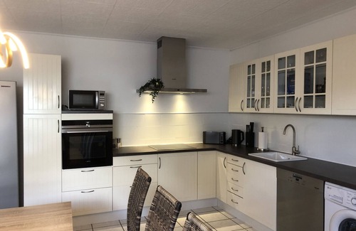 - Kitchen (washing machine, large dining table for 8+ people, ceramic hob, oven, microwave, fridge with freezer, dishwasher, sink, coffee machine, toaster, kettle, all basic equipment with crockery, cutlery, spices, etc.)