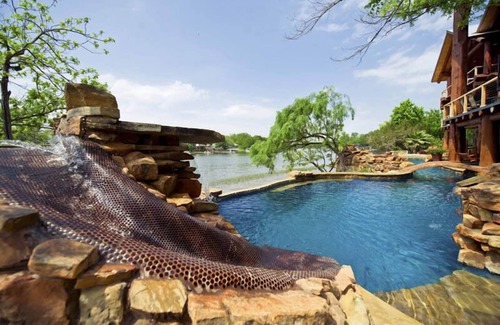 Big Timber is a 5 bedroom 7 full baths – 3 ½ baths Poolside Bunk/Party Room - 3 level lakefront decks overlooking Lake LBJ with 250 feet of waterfront perfect for swimming or fishing off the pier. Along the waterfront you have a small sandy beach area perfect for lounging and small kids. Also, there are three jetski ramps, boat parking in a cove & a rope swing.