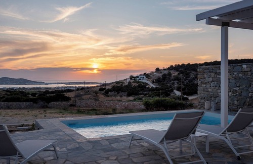 Entering the house one first encounters a large living room which eventually leads to an outdoor area of250 sq. meters and includes a dining table and a cozy sitting area with direct view to the Aegean Sea andthe island of Anti-paros. Next to the living room lies the fully equipped and very functional kitchen. Thehouse has three bedrooms two with double king-size beds and one with two single beds, as well a largebathroom and a WC. All the indoor and outdoor spaces are designed to comfortably accommodate sixpeople of any combination as it is perfect for families, friends, and couples who wish to relax and enjoythe beauty of Greek islands.