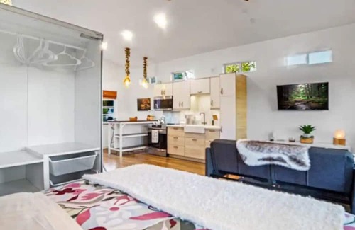 Rural, yet close to I-30, George Bush Tollway, city of Rowlett and city of Wylie in Dallas County, this new 552 sf Boho themed cabin is custom designed with love, function, art and the groovy flair of 60’s.