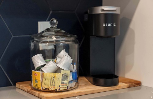 The studio’s bright and welcoming interior makes even your downtime exciting, with tall ceilings accentuating its open floorplan and natural light streaming in through windows showcasing the complex. Sink into the plush leather sofa in the living room while you keep up with all your favorite shows and movies on the mounted smart TV. The kitchen is fully equipped for all your mealtime needs, offering stainless steel appliances, glossy stone counters, and sleek white cabinetry stocked with cookware and dining ware. From takeout to homecooked cuisine, the table for 2 will host all your meals in style or can double as a workstation when you need to check in on those pesky emails.