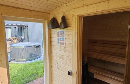 BathroomShower, Hairdryer, Private bathroom, Body soap, Toilet paper, Toilet, Towels, ShampooMedia & TechnologyTV, Streaming service (like Netflix), Cable channels, Flat-screen TVGeneralTrash cans, Heating, Private entrance, Smoke Alarm, Air conditioningActivitiesSauna, Hot tubKitchenKitchenette, Electric kettle, Toaster, Dining table, Refrigerator, Microwave, Wine glasses, Dishwasher, Stovetop, Coffee machine, KitchenwareOutdoorsPatio, Outdoor furniture, Terrace, BarbecueLiving AreaDining area, SofaViewView, Garden viewBedroomLinens, Wardrobe or closet, Childrens' cribsAccessibilityEntire unit located on ground floorBuilding CharacteristicsDetachedRoom AmenitiesClothes rack, Sofa bedEntertainment & Family ServicesChild safety socket covers, Board games/puzzles |