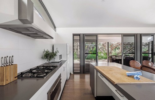 Inside, a light-filled living area features a curved ceiling and wraparound windows that frame the surrounding trees, anchored by a wood fire for cooler nights. The kitchen comes fully equipped with modern appliances and a Nespresso machine—ideal for morning coffee before a beach day. This central space flows into a covered outdoor dining area and open verandah overlooking a private paperbark wetland reserve, home to native wildlife including quendas, ringtail possums, kangaroos, frogs, ducks, and birds.