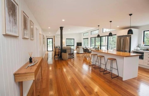 This modern, luxury home offers absolute seclusion for couples seeking a romantic getaway or a group of up to 9 people. Walk to the beach within minutes, or listen to the ocean's song in your cosy bed at night! You may catch a glimpse of the elusive white wallaby here, along with abundant bird life. Extra luxuries include complimentary wine on arrival, heated floors in the main bathroom and a quality coffee machine. The beautiful outdoor seating spaces provide options for intimate gatherings.