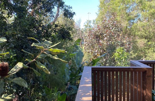 Custom made kitchen equipped with dish washer, fridge, induction burner, pour over coffee and machine, kettle and toaster. Webber BBQ amongst the trees on the deck.