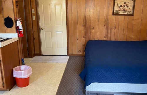 Cabin 3 - single room unit with one king size bed, kitchenette with a 4-burner cook top and refrigerator, toaster oven, bath with tub/shower.