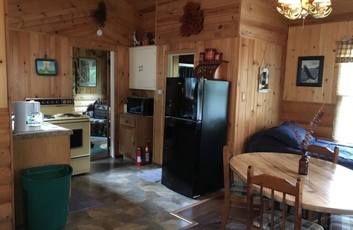 The property is surrounded by forests and trails to hike and bike. The cabin can sleep 5 and has an open concept kitchen with living and dining areas. We now have air conditioning! There is 1 bedroom with a queen bed. The living areas have1 full bed and 1 twin bed and 1 bathroom. There is parking and room for a boat and trailer. Private deck and fire pit are right next to the cabin. The Enchanted Loon B&B is next door and has a bar that seats 11 overlooking the lake. There are two large decks, swim and fishing piers shared by cabin and lodge guests. Moccasin lake is a Class A fishing lake with musky, walleye, bass and panfish of all species. Excellent for swimming and recreation. We have no public landing to place your boat, kayaks, or canoes on but there are hundreds of lakes close by. Our lake is a clear and healthy lake with no invasive species. We are concerned about invasive species getting into our lake and not allowing used rafts and floats (new out of the box is great) will help prevent their transfer. In addition, we have a fleet of aluminum boats with motors to rent for $60.00/day.