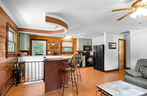 Lake Life Cabin has so much character, you are sure to be charmed from the moment you walk in. The screened in porch welcomes you for your morning coffee on the conversation set, or for a nice outdoor dinner with your family overlooking the beautiful lake view. At the end of a day in the sun you can roast some s'mores by the fire and take a nice relaxing bath in the master jacuzzi tub.