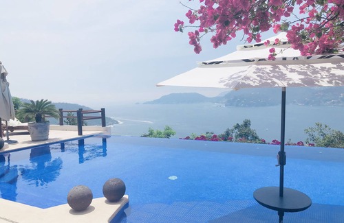 The luxury villa, CASA del AMOR, located on the southern end of Zihuatanejo Bay, 50 meters from the shore, combines the timeless beauty of "Mexican Traditional" with the practicality of "American Modern " featuring four spacious bedroom suites , six bathrooms, spacious living, dining and entertainment areas. Gently curving illuminated staircases and walkways flow throughout the villa. All rooms have air-conditioning in addition to ceiling fans, and the floor to ceiling glass windows provide panoramic views of Zihuatanejo Bay, including its beaches and the Pacific Ocean. The impeccable decor with numerous details from the finest folk art to Spanish Colonial type armoires creates an interior that is both exquisite and comfortable. The appropriately appointed living room opens onto yet another pergola covered terrace with brilliant, panoramic views~ equipped with comfortable seating and dining set, this terrace is perfect for informal dining or watching Zihua's spectacular sunsets. Adjacent to the living room is a spacious, formal dining room with built-in marble and parota wood sideboard. The dining room easily seats eight and is in close proximity to the bright, modern kitchen complete with granite countertops . The deluxe master suite, outfitted with king bed, bath and generous wardrobe space, large dressing and sitting areas, private terrace and jacuzzi is privately located on an upper level . Overlooking the pool from another level are two large, comfortable guest suites; one with king-bed, the other with twins {or converted to king}, each with spacious double-sized baths, ample wardrobe, dressing space and access to their shared terrace...providing exceptional views of bay, beaches, ocean and quaint fishing village of Zihua. On the lowest level, you'll find a roomy king bedroom suite consisting of luxury bath, generous wardrobe space, kitchenette, and a sitting area with a single bed…perfect for a child. An open air, entertainment and leisure area with a wet bar, sofas and chaise lounges face the fresh water infinity pool and a sun terrace that seems to literally reach out and embrace the sea. To add, the entire property has newly been upgraded with Fiber-optic/Wi-Fi throughout. If hospitality is defined by attention to detail, guests will assuredly find it at Casa del Amor where our attentive full time staff is looking forward to pampering you. Within walking distance to the beach...or we will be more than happy to give you a ride. For added security, we have an onsite caretaker 24hours a day .