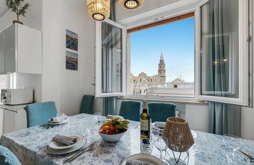 The third-floor (with lift) apartment, which sleeps 8 people, has lovely sea views from one side and looks out over the tower of the famous 12th-century Monopoli cathedral on the other. It has been beautifully renovated in a contemporary style.