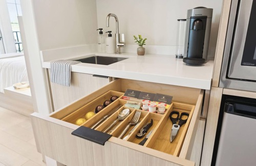 - Kitchenette: Nespresso Vertuo, mini-fridge with freezer, Panasonic microwave with air-fryer, plates and utensils, no stove