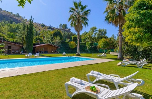 Located in a natural environment and close to the Genil River, this villa consists of two beautiful wooden houses and a spectacular garden area with trees and a huge private pool.