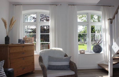 Look forward to a special kind apartment on a former farm in a single location. The very spacious and idyllic property is just 2 kilometers from the Baltic Sea. It consists of a charming farmhouse and a unique barn. The buildings are surrounded by many gardens that invite you to relax and awaken the feeling of being connected to nature. The 100 sqm apartment is located in the farmhouse, which was renewed from scratch and has a nice thatched roof. The apartment 'Hygge' was furnished in the Danish style with great attention to detail and offers plenty of space for deceleration. Furthermore, the apartment captivates with a modern kitchen for cooking together and an individual sauna area with a great view of the fields. Just convince yourself, we look forward to seeing you!