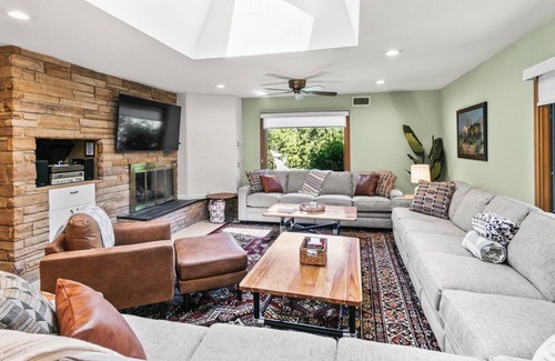 Living Room • Gather the entire group to watch a movie or play a game while listening to one of the many vinyl records from our collection or use Bluetooth for your own playlist. The sofa and chairs comfortably seats 16.