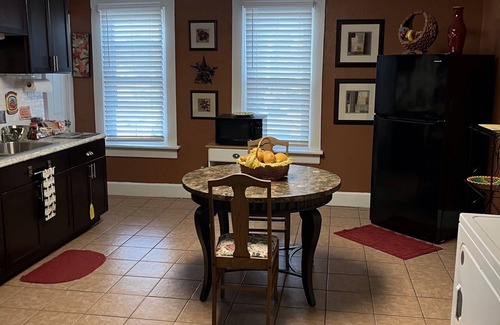 Second Floor Unit: Kitchen, Living Room, Bedroom with queen size bed and TV room with (2) twin beds and enclosed porch/smoking room. Privacy fence, security cameras, private parking in the rear, several restaurants within walking distance (Whitey's Ice Cream, Hungry Hobo, Jimmy Johns, Subway, Happy Joes, Taco Bell, 711, Fuji Cafe, just to mention a few. Very clean, pristine unit with full kitchen. Within Walking distance of Mississippi Valley Fairgrounds, Putnam Museum and Fejervary Park.