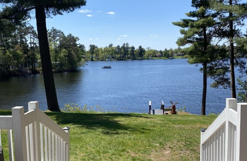 Come experience this unique and special place with beautiful, serene sunset views on Prairie Lake in Chetek, Wisconsin. Drive down the long, secluded driveway surrounded with mature white pines to a private waterfront home. Located in a cove, this is a very popular fishing spot. The lake provided excellent fishing for pan fish, walleye, northern pike and bass. Walk down the steps to an aluminum dock with a two person bench. This is the perfect place to put your feet in the water or enjoy a good summer book. There is a swimming ladder for those who want to cool off after a warm summer day. Enjoy grilling out on the deck with a Pergola perfect for those summer picnics. After the sun sets, enjoy roasting marshmallows around the fire pit. This four bedroom, three bath house has wood floors flowing throughout the main level. The primary bedroom has large patio doors that open to the deck with beautiful views of the lake. The guest bedroom has a large closet with plenty of room to hang your clothes. There is a large updated kitchen with a French door refrigerator, a dishwasher, microwave, coffee pot and a gas stove. The dining table has enough room to host six guests. The downstairs is the perfect place for the kids to hang out. The two downstairs bedrooms have two sets of bunk beds each with queen mattresses. There is a large screen TV downstairs and many fun family games and books to enjoy after a long day on the lake or a rainy day. Northview Lodge is located one mile from the downtown area with many local shops and restaurants.