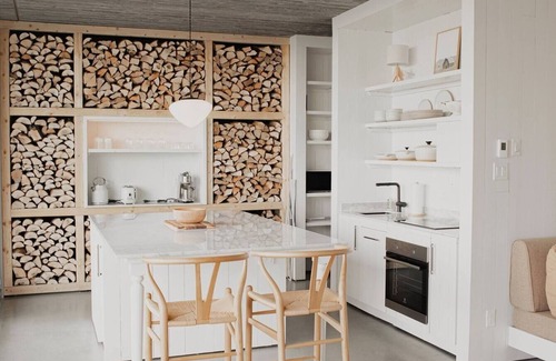 The pavilions complete the TERACEA experience with a collection of independent, comfortable, and intimate dwellings. True sanctuaries where the harmony of materials takes center stage. Built into the hillside, they naturally find their place at the heart of the property. This open, airy little village—also home to the shared spaces—is known as Le Hameau. Designed to ensure maximum privacy, each pavilion has its own entrance, is enclosed on three sides, and extends into a sheltered terrace facing the river. Their layout has been thoughtfully conceived to offer a unique getaway experience: the feeling of having your own private, fully equipped suite in the heart of Charlevoix’s beauty. Inspired by the surrounding forest, the pavilions' exterior is clad in an elegant stack of logs, arranged to showcase their pale cut ends—a design of warm modernity. Inside, Florent Moser, in collaboration with architect Alain Carle, has crafted a rustic space wrapped in luxurious comfort.