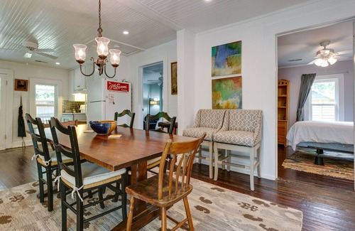 That said, as of March 2022, we added an ensuite bath where an old closet used to be and opened up the den to the kitchen dining area. We attempted as best we could to level her out, but that just proved beyond the scope. Back in April 2018, we also performed another little renovation, so if you've stayed here before or saw previous reviews about crazy bright paint colors, you'll be pleasantly surprised! It no longer looks like a box of crayons exploded inside. The renovation included fresh paint inside & out, a new tin roof, removal of the vinyl siding outside to go back to the original wood siding, updated light fixtures, a new deck, new operable windows with screens throughout, and a new sliding glass door and glass top front door that both help to let in a lot more natural light.