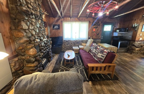 Step back in time with this classic 1940s cabin, thoughtfully updated to retain its rustic charm. Featuring original stone wall fireplace, and a vaulted pine ceiling, this cabin embodies the perfect blend of history and comfort. The spacious bedroom offers two queen beds and a lofted double, ideal for kids. The bathroom includes a walk-in shower.