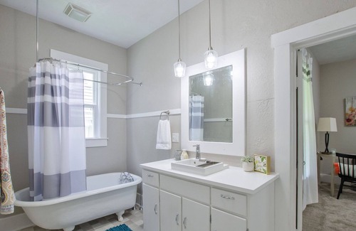Two bedrooms and one full bathroom allow for plenty of privacy. One bedroom has a king-size bed, while the other has a full-size bed. A charming full bathroom features a vintage clawfoot bathtub and a marble vanity sink. Location Perfection in Kokomo