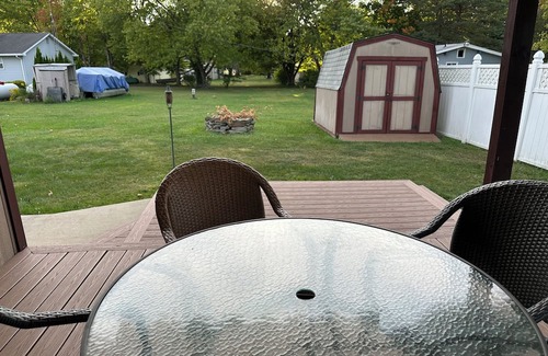 Welcome to Jean’s by the Lake. A beautiful property full of updated furnishings. Tucked away in a quiet lakeside neighborhood surrounded by the State Park. enjoy a large yard, sun room, and covered back deck overlooking the fire pit. Take a 5 minute walk to private lakefront access or explore all the area has to offer. large paved driveway for boat storage and short distance to the multiple lake access points.
