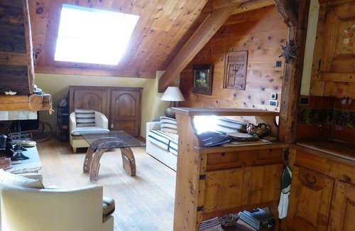 T3: 61 m² on the ground, Carrez surface 50m². Excellent location, on the top floor of a village house (divided into small co-ownership), mountain atmosphere, wood, fireplace (not usable) in the living room (sofa bed), custom-made layout, in Swiss stone pine, kitchen with pantry, solid parquet flooring.
