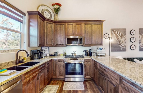 This well-equipped home boasts a range of amenities to ensure a comfortable stay, including a gas fireplace, central AC, washer/dryer, and a fully stocked kitchen with modern appliances. Indulge in the ultimate relaxation with your own private 4-person hot tub, perfect for unwinding after a day of exploring Water Wheel or Fossil Creek and its stunning waterfall, just a short 20-minute hike away. Enjoy the mountain views from the deck or patio, gather around the firepit for cozy evenings, or grill up a delicious meal on the gas grill.