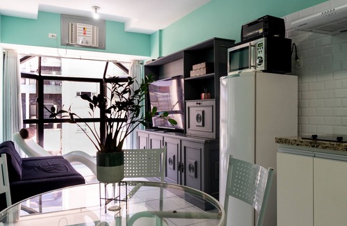 406 GREEN: Approximately 60 m2; double bed “queen”, with American spring mattress; sofa bed for 2 people; bedding; Swimsuit; full kitchen, electric stove with two burners, coffee maker, microwave and fridge; Smart TV with 55 inches; 23 inch TV in bedroom, cable TV and air conditioning. It accommodates up to 4 people.