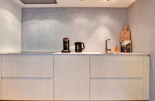 Layout: Ground floor: (open kitchen(hob(electric), electric kettle, hood, coffee machine, combination microwave, dishwasher), Living/diningroom(TV(smart TV), dining table, decorative fireplace, seating area), bathroom(bath tub, shower, washbasin, toilet))