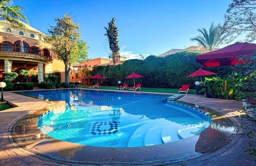 Escape to this stunning villa near Marrakesh city center, featuring 5 spacious bedrooms, a sparkling pool, and a relaxing hot tub. Surrounded by lush gardens, this serene retreat offers modern comforts and Moroccan charm. Perfect for families or groups seeking tranquility just minutes from the city's vibrant attractions. Experience unmatched relaxation and elegance in this private oasis.