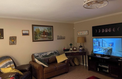 Business or Pleasure? Skip the corporate hotels, support local and feel the comforts of home away from home. Master bedroom, 3/4 Jacuzzi brand bathroom, cozy living space with full amenities, kitchen and off street driveway parking for one vehicle. Located in the heart of the West Valley, 10 minutes to just about anything local to Surprise, Glendale, Peoria and all the Sun City, Sun City Grand, Sun City West communities/neighborhoods but even Phoenix is less than 30 minutes. Less than a mile to grocery, shopping, pharmacy and nail spa plaza. Owner occupied part time as intermittent travelers that may stay on site in private room with private entrance and for laundry service upon request. Community back patio, small grill and pool in large, private block walled backyard. Professionally cleaned and sanitized. Local customized handbook guide to restaurants, shops, big box stores and anything else you might need or want access to. Perfect for retreating couples, traveling nurses, new home buyers, commonly used for parents of teen athletes in town for seasonal sports events or moving into college and business professionals. Whether you’re visiting friends or family, in town for an event or appointments or just need a nice relaxing, quiet and safe getaway. Thank you and happy travels!