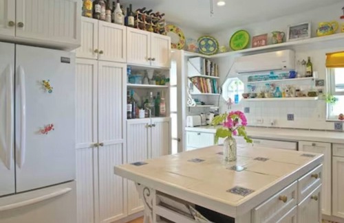 Island-style cottage kitchen w/ updated and quality appliances, including: large gas stove and double oven, a French door fridge, dishwasher and plenty of kitchen ware for those cooking enthusiasts! You are very welcome to use any existing condiments if any are left after previous guests.
