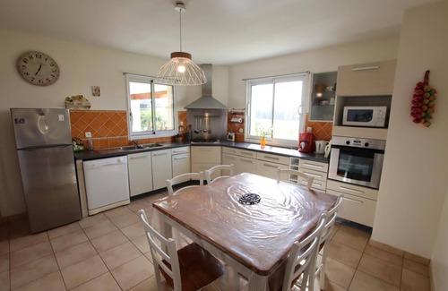 New detached house, on one level, on agricultural property (corn), near another gite and the owners' house, in a quiet area away from the village. View of the Pyrenees. Bright, pleasant and functional gite. Fitted kitchen (oven and microwave, fridge-freezer, gas hob, dishwasher), living room (TV, DVD and CD player). 2 bedrooms (1 double bed. 2 single beds). Shower room, wc. Cellar (washing machine, dryer). Electric heating in supplement. Possibility to rent sheets, towels. WIFI internet connection. Private covered terrace facing south-east (garden furniture, electric griddle, table tennis), Unfenced land overlooking fields. Volleyball net. Private parking for 1 car.