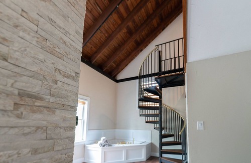 Be ready to catch your breath when you enter this two-level wonder as it is truly breathtaking. A stone room divider rising to the second level dominates the open concept living room and spa area. The divider encompasses a two-sided gas fireplace and a XX-in. flat-panel TV with WIFI, which faces the living area. After relaxing on the cushy sofa, make your way to the spa area. But on your way, stop at the food prep area to pour a glass of wine, pop open a beer, or concoct your own libation, and mic some snacks. Then retreat to the Jacuzzi-style tub. Turn on the jets, start the bubbles and slide into heated bliss as you think to yourself, “Yeah, this is the life!” At day’s end, climb the spiral staircase to the loft and slumber in the king bed to your heart’s content. Yeah, this is the life, so reserve your getaway date here.