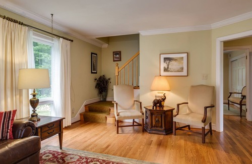 Clarington is tucked away on 119 acres in the Earlysville area providing ample amount of privacy. It is located about: 15 minutes to the airport and shopping centers, 25 minutes to UVA and Downtown and about 25 min to beautiful Skyline Drive. It is a fully equipped 4 bedroom home including a private pool. Lounge on the delightful screened-in porch surrounded by woodlands. The newly redecorated ground floor master bedroom has a king bed and en suite bath with Jacuzzi and shower. There are three more bedrooms upstairs (2 double bedrooms, and one with two twins and a bunk set) There's also a second floor full bath. Main floor features dining room, living room with flat screen and newer gourmet kitchen with everything you may need for family meals. Or take meals on the screened-in porch with seating for 11+. Wi-Fi, zoned AC, on-site laundry and a fenced-in pool complete the picture for a delightful accommodation in the country.**POOL SEASON** the pool is open for guests use May 1 - September 30th. The pool will be closed outside of those dates.