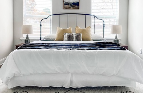 This modern, stylish and family-friendly ranch welcomes you to relax and feel at home. The home sleeps 9 in the three bedrooms, has 2 full bathrooms, and offers open concept living with a fully equipped kitchen with children's dinnerware, a kitchenette eating area, and a fully furnished living room with an awesome tv stand/electric fireplace and even has an area for the children.